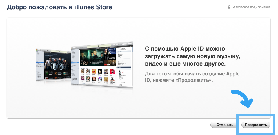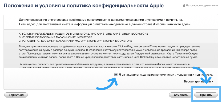 4-қадам. Кейин “Добро пожаловать в iTunesStore” ойнаси очилади. Биз “Продолжить” тугмасини босамиз. Шундан сўнг бизга яна бир ойна очилади ва унга “ҳамма шартинга розиман-эй” деган жойига белги қўйиб, “Принять” тугмасини босамиз.