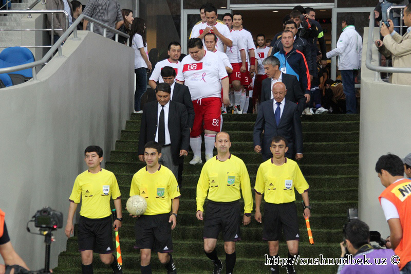 Иккинчи ўйинда майдонда эстрада юлдузларидан ташкил топган “Хонандалар” жамоаси ва актёрларнинг “Ҳижолат” жамоаси тўп суришди